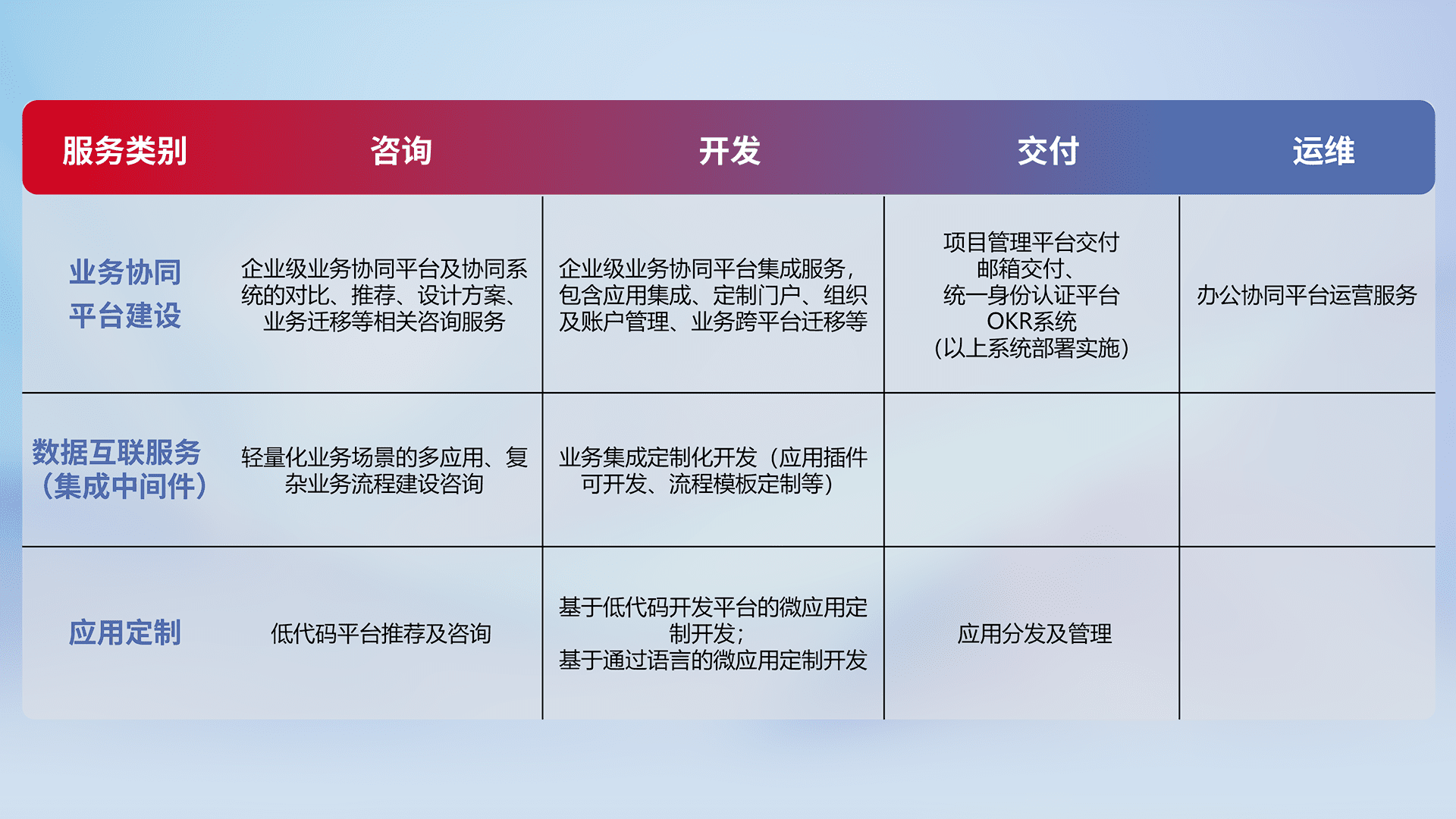 针对钉钉、、、、企微、、IDaas等平台级产品提供产品的规划、、、方案、、、、交付、、、定制化开发等服务,,实现如统一协同办公、、智能客户服务、、、混合会议管理、、、智能数据查询、、、、等业务场景,,实现数字化转型。。。。