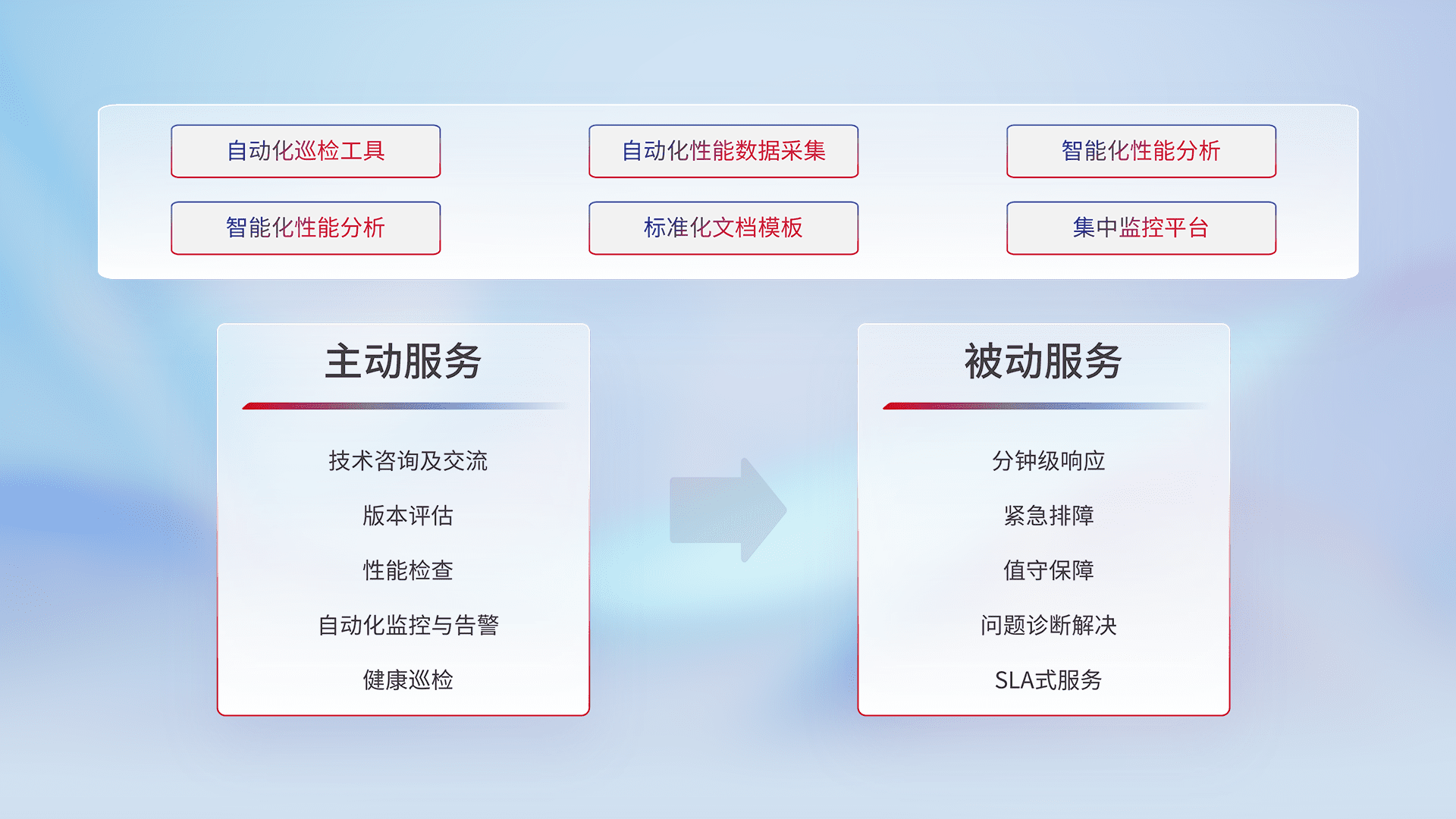 智能化工具和标准化文档,,,保障服务质量,,,提供主动服务(包含技术咨询、、、、版本评估、、性能检查、、、、自动化监控与告警、、、、健康巡检)和被动服务包含(分钟级响应、、、、紧急排障、、、、值守保障、、、、问题诊断解决、、、SLA服务)。。。